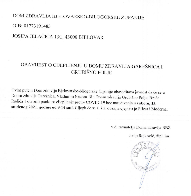 OBAVJEST O CIJEPLJENJU U DOMU ZDRAVLJA GARESNICA I G. POLJE
